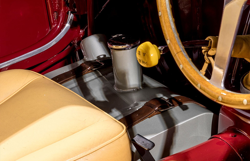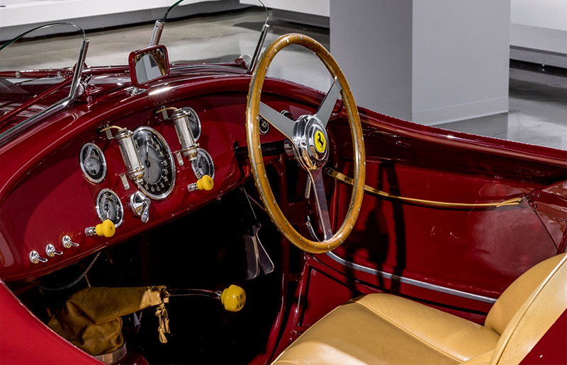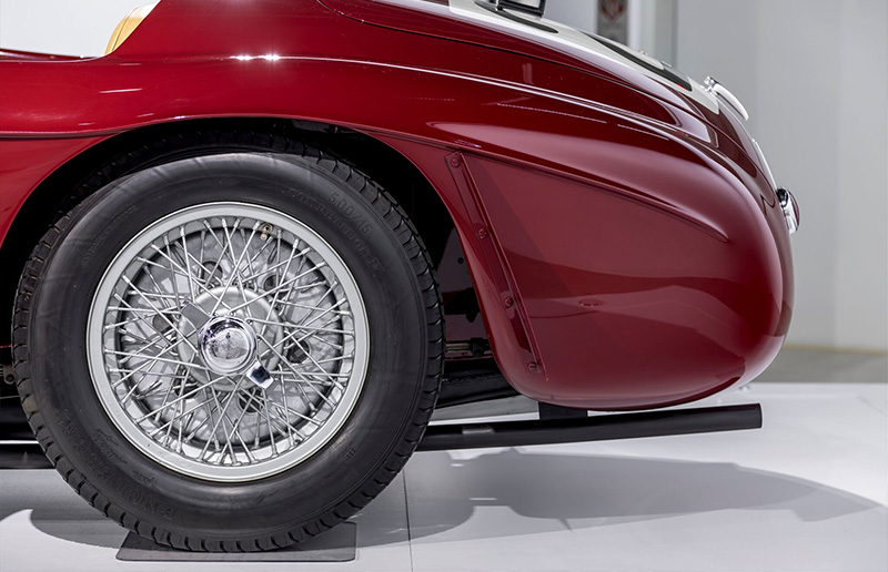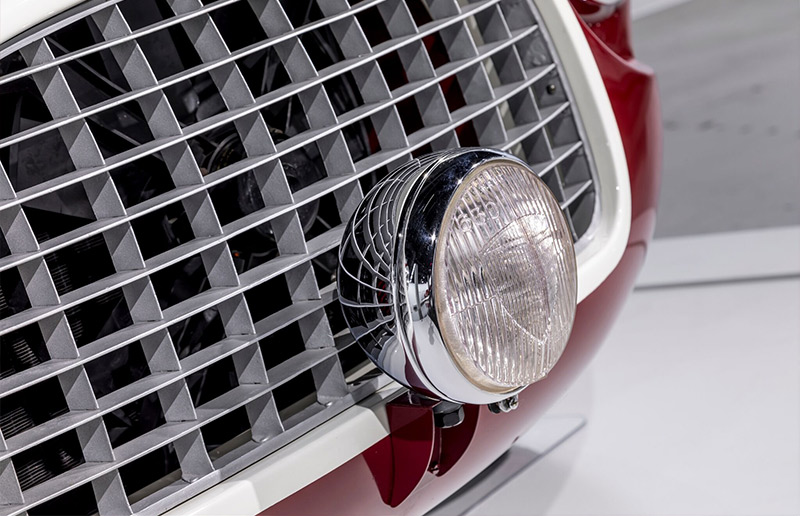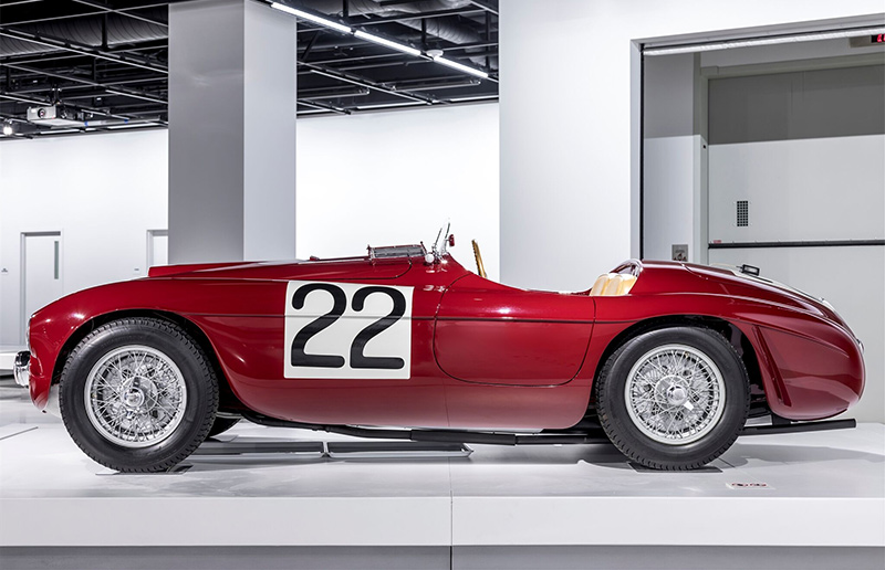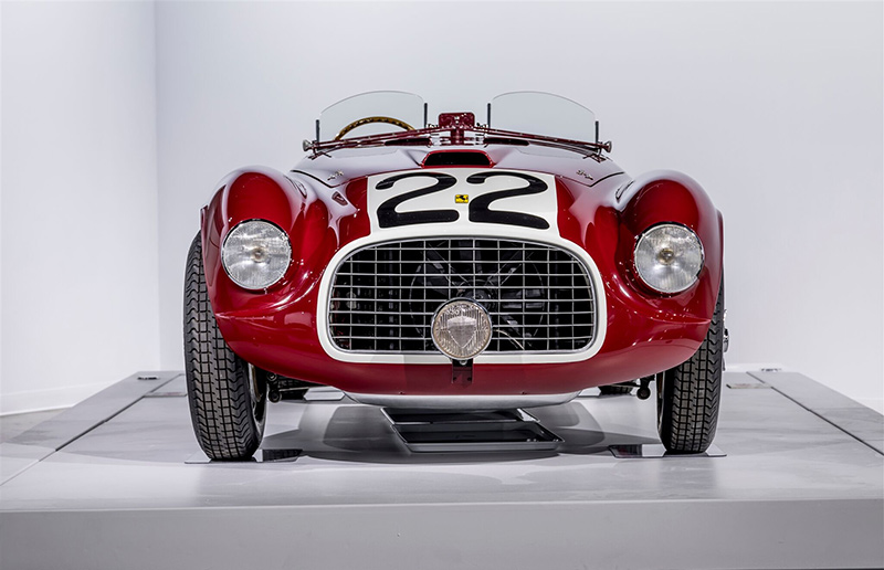 The 166 MM features an overhead cam V-12 engine similar to those of its predecessors, but weighed substantially less thanks to its superleggera (“superlight”) body by Carrozzeria Touring of Milan. The compact, streamlined coachwork was described by a journalist as a barchetta (“little boat”), a term now used for any open Italian two-seater. The “MM” in the model designation stands for Mille Miglia, an iconic Italian long-distance race won by this car in 1949.