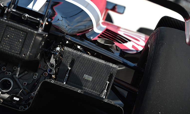 The top of the sidepod has been designed to exceed FIA side impact tests. The inlet duct, sidepod side and bottom have been constructed in hybrid carbon/dyneema fibers for improved penetration protection. Oil and water radiators have been moved forward, adding cushioning on the driver’s side.