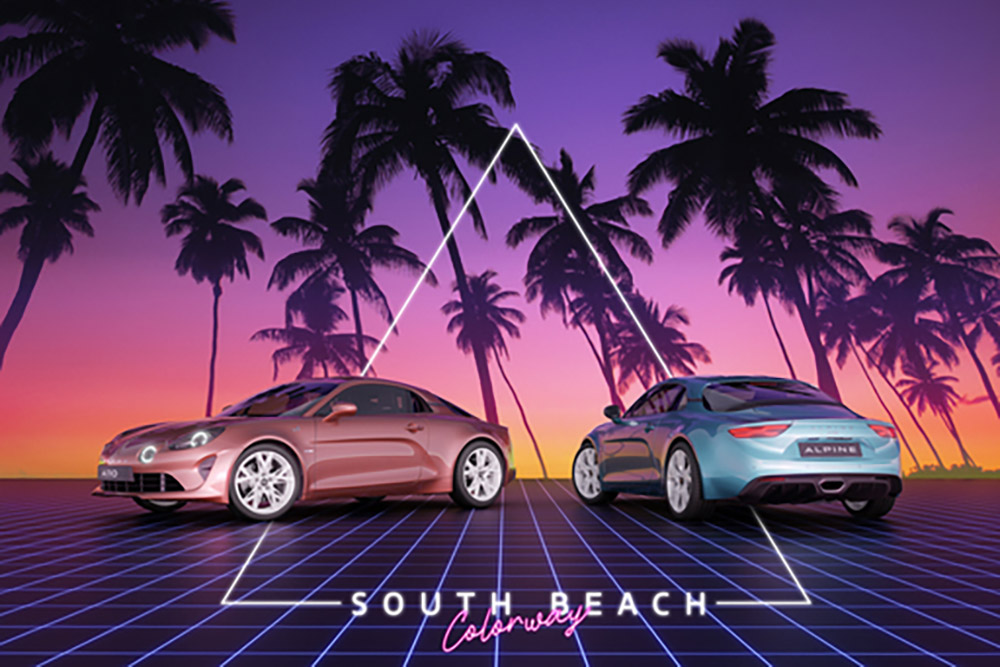 Despite its pop-art and disruptive appearance, the South Beach Colorway fits perfectly into Alpine’s identity, with Bleu Azur and Rose Bruyère being two of the brand’s historic colours. Transforming this retro-looking edition into a unique contemporary icon, made to enjoy every turn of the road. These two colours are taken from the colours made available by the Atelier Alpine customisation program. With 20 colours inspired by the brand’s famous heritage colours, the Atelier Alpine also offers multiple additional customisation choices: with a variety of wheel finishes available and an extensive brake caliper color catalog, each A110 can now be as unique as its owner.