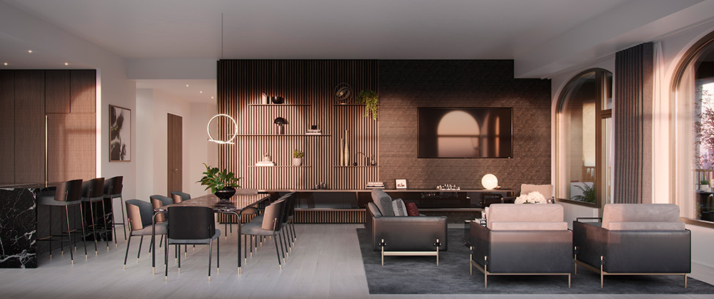 Within each home, residents are presented with a grand living and dining room, featuring furnishings, textiles and fittings curated by Marek Reichman and Sir David Adjaye. The living room offers city-wide views, clean lines and sleek furnishings from the Aston Martin Home Collection by Formitalia, with every piece made in Italy. The sofas and armchairs combine elements of leather, metal and fabric, as well as beautiful detailing, to evoke the richly crafted and tactile qualities of Aston Martin’s automotive interiors.