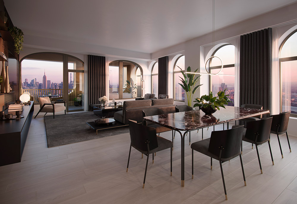 130 William offers 20,000 square feet of lifestyle and wellness amenities, including an infinity-edge swimming pool, cold and hot plunge pools, dry sauna and massage rooms as well as a state-of-the-art fitness center and spa with cool-down terrace, yoga studio and basketball court. Residents will also enjoy a private IMAX movie theater, golf simulator, resident lounge, club and game room, chef’s catering kitchen with a private dining area, children’s activity center, pet spa, outdoor terraces, and private rooftop observation deck located at the top of the building.