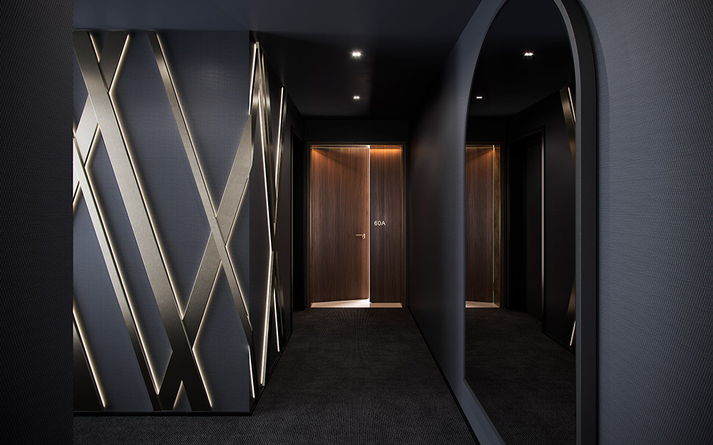 When residents first step off the elevator, they will see interior design elements featuring Aston Martin’s signature crosshatch pattern in a bronze finish. Beneath the bronze detailing is wallpaper designed by Adjaye Associates, while a bespoke smoked glass mirror created by Aston Martin Design reflects the skyline view in a distinctive arched form which is a nod to the arches on the façade.