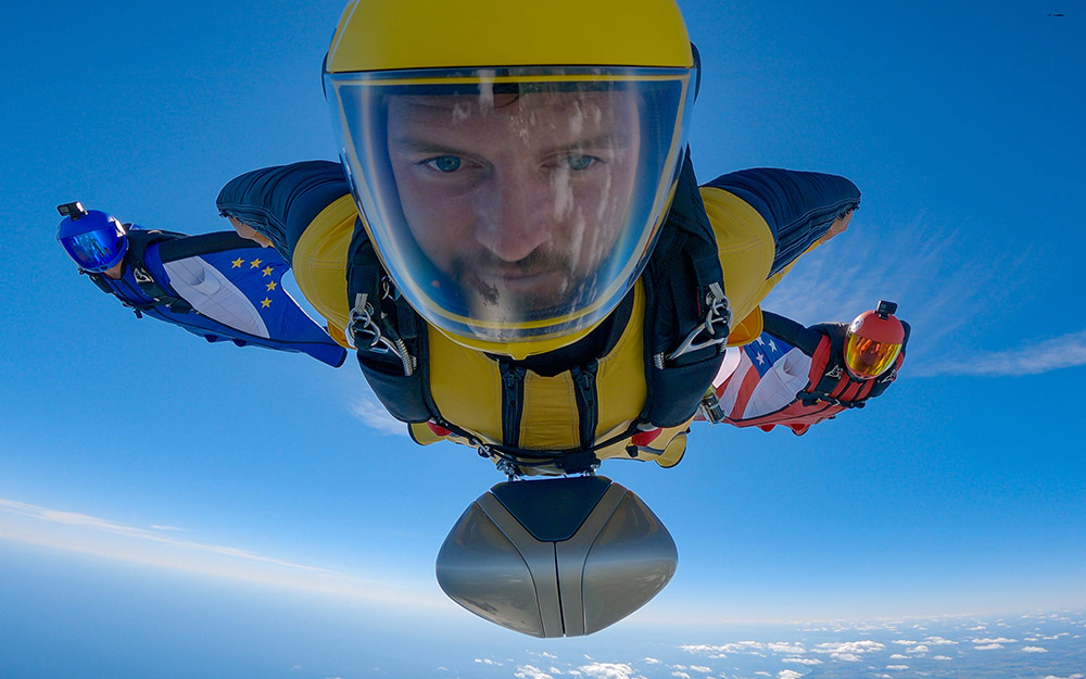 For the stunt, Salzmann and his team leapt out of a helicopter from nearly two miles above sea level, with the Ryder Cup enclosed in the trophy case, and fastened to the Austrian’s body using a device that guaranteed him the necessary freedom of movement and also had the required aerodynamic properties. This made it possible to land safely with the trophy after two minutes of flying at a top speed of nearly 143 miles per hour.