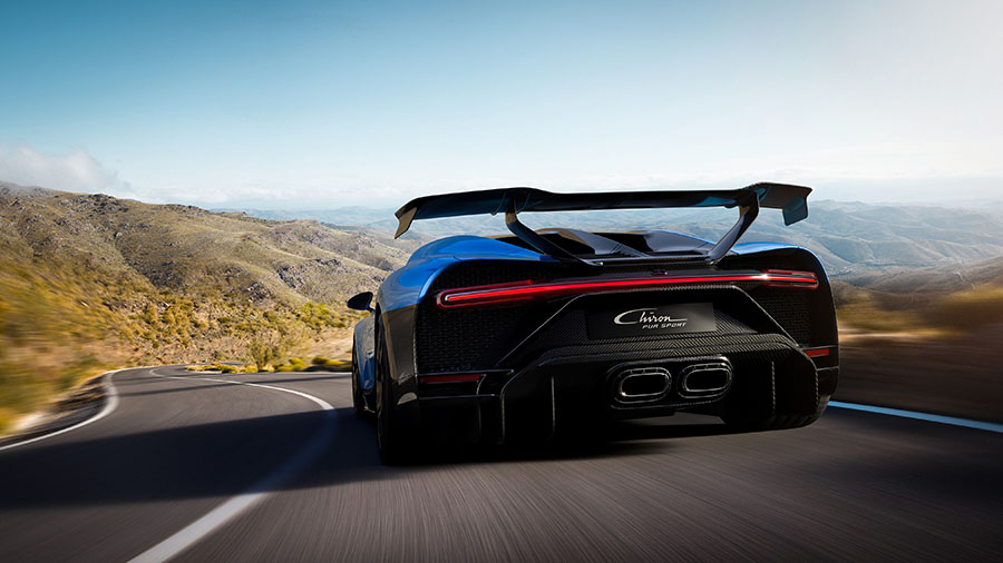 Elegant and extremely athletic. An uncompromising hyper sports car for even more agility. Pure and extreme. That is the new Bugatti Chiron Pur Sport. The weight of the Chiron Pur Sport has been reduced by 50 kilograms, while sophisticated aerodynamics components – including a 1.90 m wide rear spoiler – ensure increased downforce. At the same time, omission of the hydraulic system for the otherwise automatically extending spoiler also reduces the weight. Thanks to a new material compound, the newly developed high-performance tyres Sport Cup 2 R from Michelin in 285/30 R20 at the front and 355/25 R21 provide outstanding grip even at high cornering speeds.
