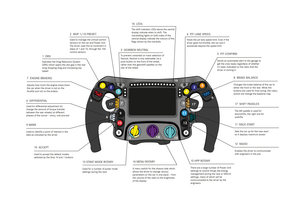 The importance of the button depends on the situation. If, for example, a driver can’t hear his race engineer anymore, the volume control of the radio suddenly becomes very important. If you were to ask a driver which button he thinks is the most important, he’d probably choose the “Strat” switch as it has a big impact on the performance of the car. It controls the Power Unit modes and will impact both the performance of the internal combustion engine as well as the deployment of electrical energy of the MGU-K and change the recovery of energy of both MGU-K and MGU-H. Since there are different mileage allocations for each strategy mode to balance performance and reliability, the driver will usually be told by his race engineer which “strat mode” he should use at a given time.