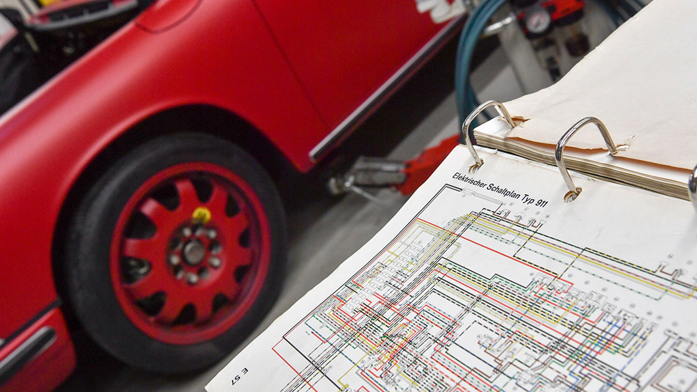 The philosophy of the Porsche Classic Factory Restoration department is to restore the vehicles so that they as true to the original as possible. The search for authentic small parts such as cable clamps, rubber grommets and sealing plugs for the 2.0-litre S engine proved to be difficult. “Replica parts from third-party suppliers are out of the question for us. Luckily we can reach into our ‘treasure chest’ in such cases,” says Makrutzki. Porsche Classic does not just have access to the central warehouse with currently more than 60,000 different genuine spare parts: the in-house specialists also have at their disposal the original straightening sets, frame gauges, data sheets and technical drawings.