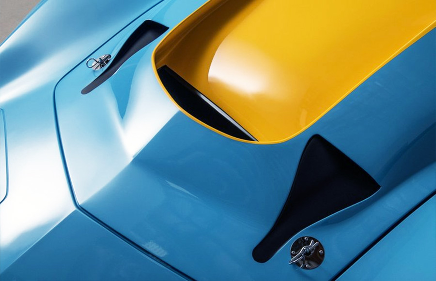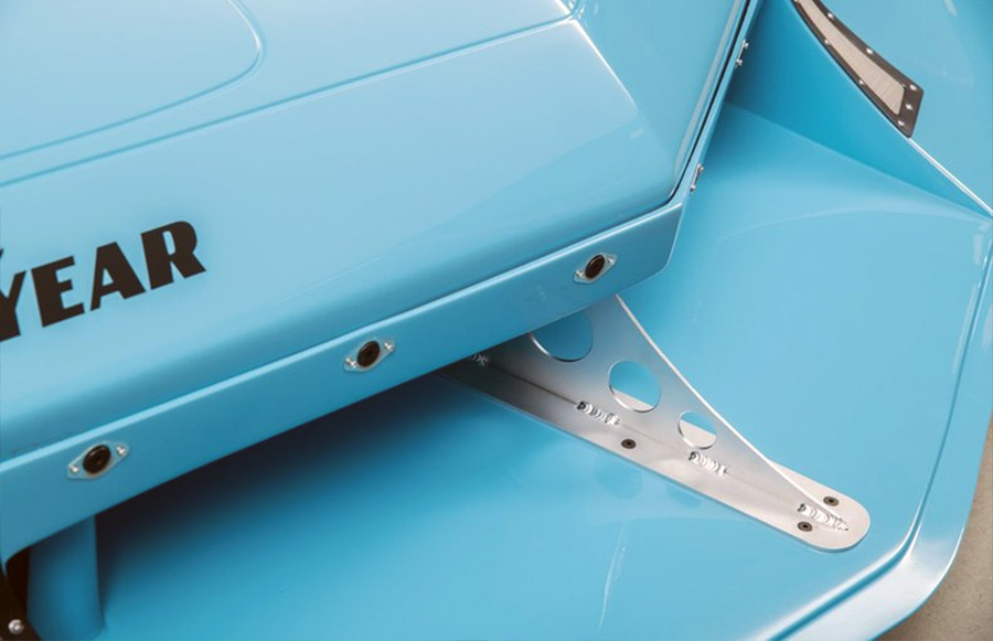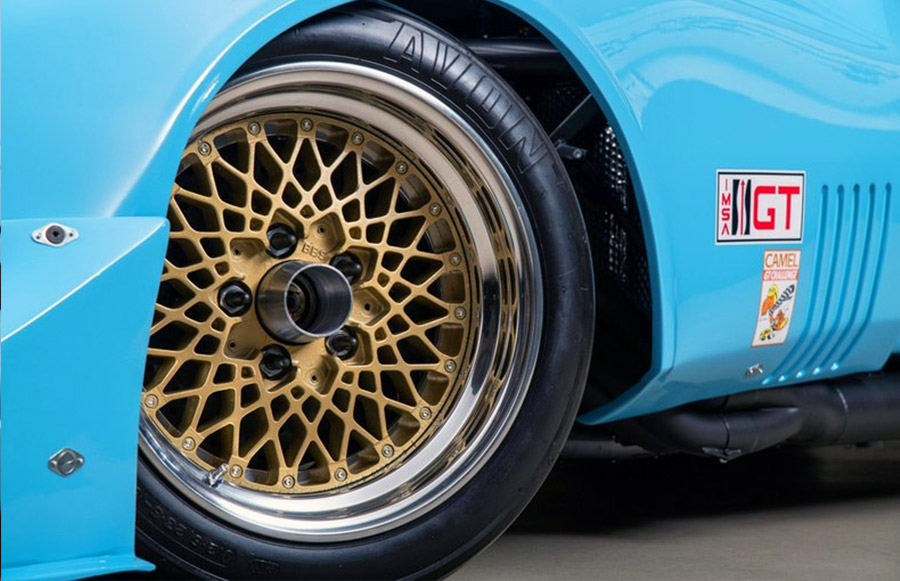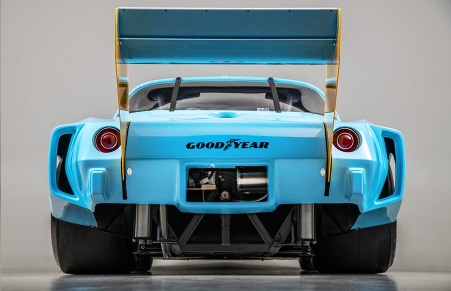 With the tube-frame chassis now stripped down of all its parts, the entire chassis and body work were then stripped of their remaining paint. Canepa thoroughly addressed any parts of the chassis and body work that needed attention before heading to the body shop. Countless hours were spent on sanding and prepping the chrome-moly tubing for its signature grey metallic paint, which is stunning to see in person. The long and swooping blue body work received the same thoughtful treatment with new bright baby blue paint. The hood and rear wing, the most standout features of the car, were painted bright JLP Racing yellow. Once the frame and body were finished, Canepa’s Motorsport division went to work on reassembling the IMSA Corvette. Over the course of many months, the baby blue IMSA racer began to take shape. With components slowly reinstalled, the car began to take on its original form and return to its former 1978 glory. With all components now assembled onto the car, the final fitment of the bodywork gives the Corvette it’s menacing stance, hiding the trick chassis underneath the sculpted fiberglass body.