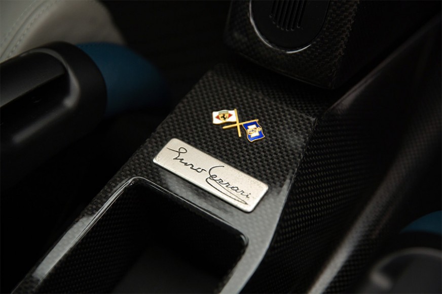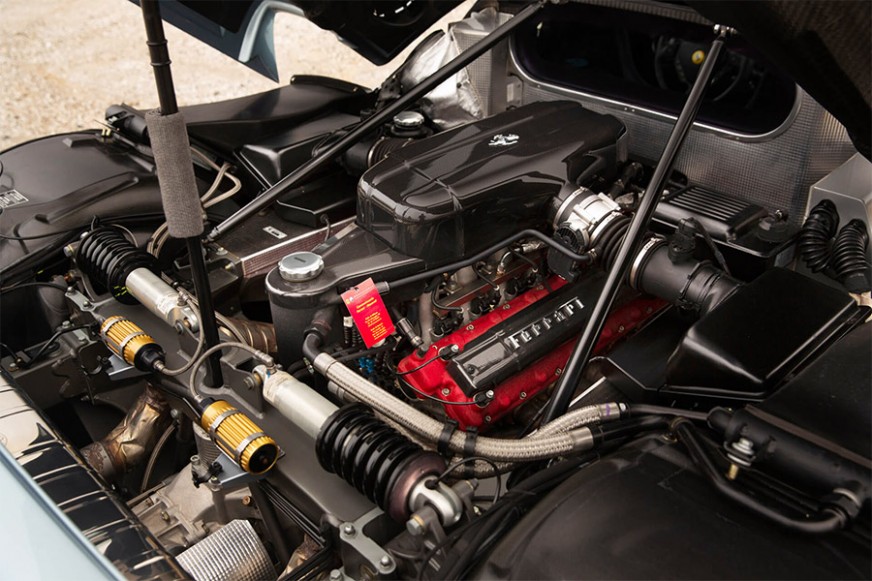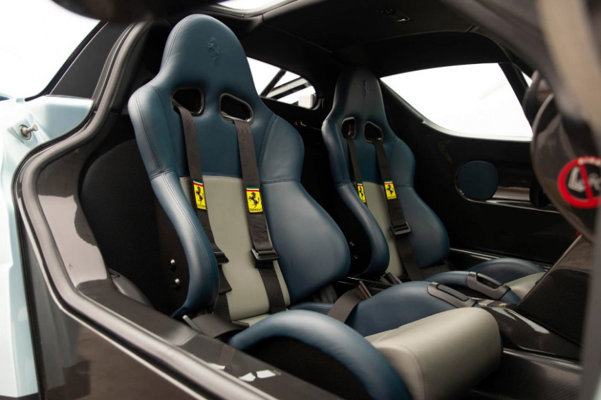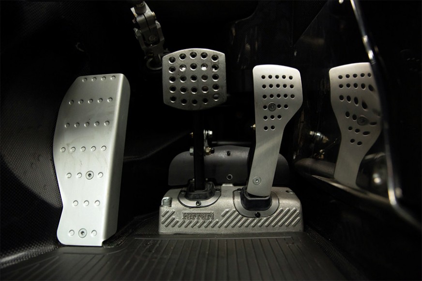 The interior was relatively spartan, with most surfaces made of carbon fibre, electronic traction controls and steering wheel-mounted shift lights installed, and the sound system, air conditioning and electric windows omitted. In development, Ferrari placed great attention on the “human-machine” interface to put “the driver in the best possible condition to exploit the car’s extreme performance,” as the brochure stated.