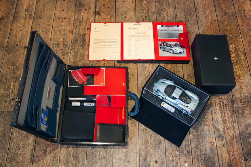 Today, the car is accompanied by its original Certificate of Origin, a congratulatory letter from then Ferrari President Luca di Montezemolo, images from production, owner’s manuals, the warranty booklet and leather pouch, a spare key, and Enzo model, a toolkit and Schedoni carbon-fibre briefcase, a car cover and a battery charger.