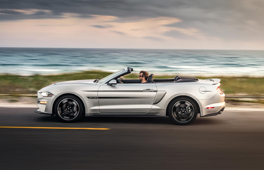 Today, the 2019 California Special for Mustang GT is a visual standout, featuring a trademark fading stripe that traces from the 5.0 side badge to the rear fender scoop. A signature Ebony Black and Race Red script California Special badge adorns the trunk lid. At the front, the car follows the blacked-out open grille and picks up the Mustang Performance Pack 1 splitter. The California Special wears unique five-spoke painted machined wheels.