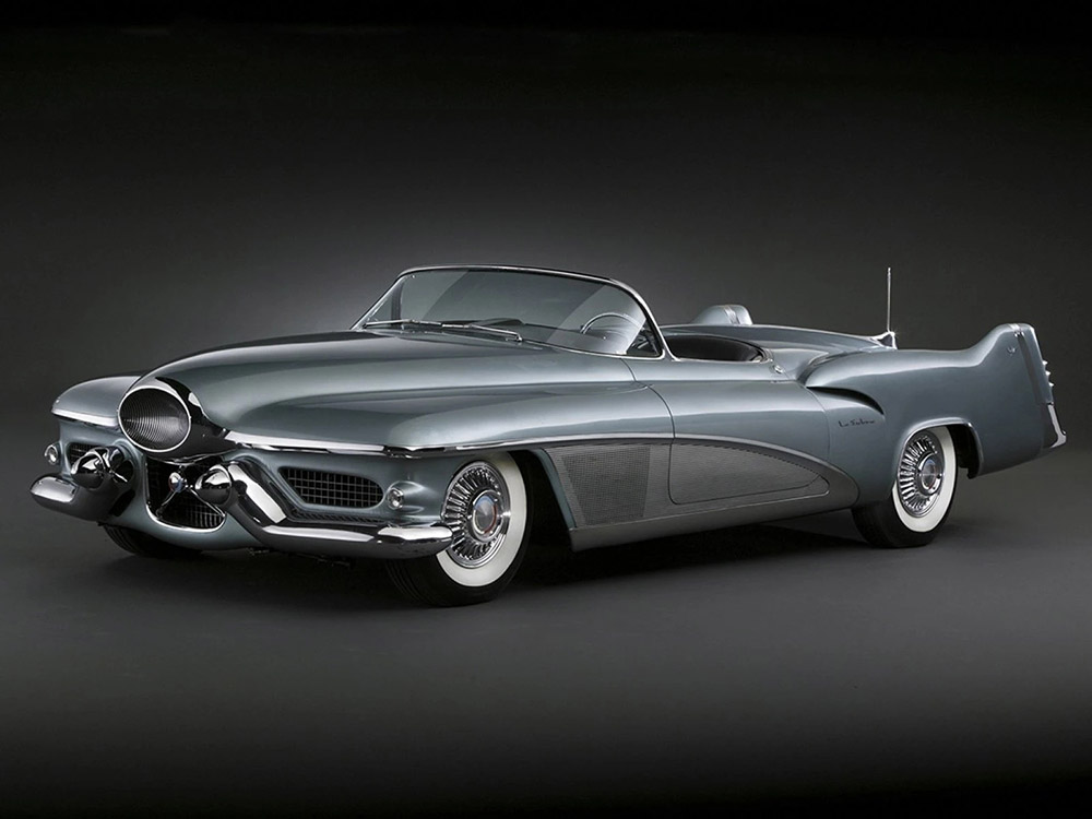 Widely considered to be Earl’s greatest work, the LeSabre concept is, a masterpiece that represented Earl’s audacious vision of the future. Its styling was inspired by jet aircraft design—in fact, it is named after the F-86 Sabre, the first supersonic fighter jet. Its prominent center oval grille rotates to reveal two close-set hidden headlamps behind it. Its sleek bodywork is composed of aluminum, magnesium, and fiberglass; is ornamented with front-bumper Dagmars; and finishes in a jet-style tail cone at the rear. Power comes from a 335 HP, 215 CID V-8 engine designed to run on both gasoline and ethanol stored in aircraft-style fuel bladders within the LeSabre’s prominent tailfins. The engine is mated to GM’s first rear-mounted Hydramatic transmission. Behind the wraparound windshield was an aircraft-inspired cockpit that featured heated seats, a water sensor that would automatically raise the power top at the onset of rain, and controls for a chassis-integrated jack system. LeSabre was GM’s centerpiece of the show circuit. Once retired from those duties, like its Y-Job predecessor, it became Earl’s personal vehicle.