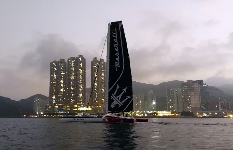 Shortly after sunset in China, under a cloudy sky and with light winds, the Giovanni Soldini and the trimaran Maserati Multi 70 left Hong Kong in search of the record set by Gitana 13 in 2008. The official from the World Sail Speed Record Council, the organization that validates oceanic records, started the stopwatch at 10:43:23 UTC (18:43 in China, 11:43 in Italy) when Maserati Multi 70 crossed the starting line positioned between the Tai Long Pai and Nga Ying Pal lights, at the exit of the Tathoong canal, the eastern access to Hong Kong harbour.