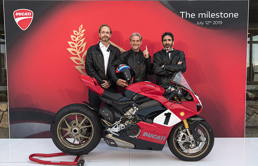 For its world-first preview, Ducati chose round nine of the Superbike World Championship, taking place this weekend at Laguna Seca (California, USA). Here, Francesco Milicia (VP Global Sales & After Sales Director Ducati Motor Holding), Jason Chinnock (CEO Ducati North America) and Carl Fogarty unveiled the Panigale V4 25° Anniversario 916.