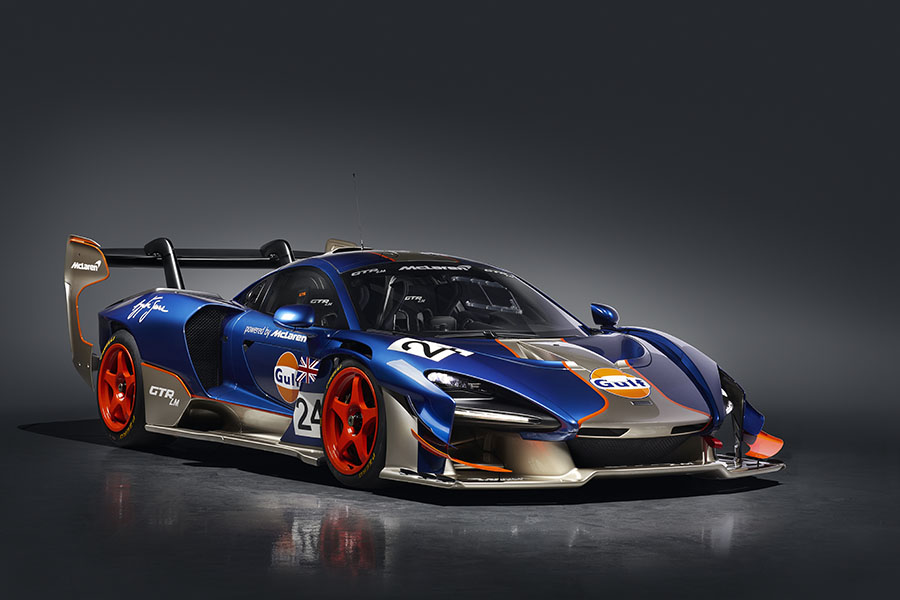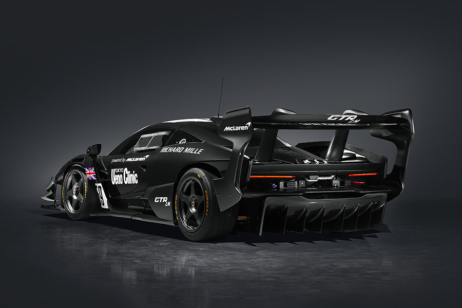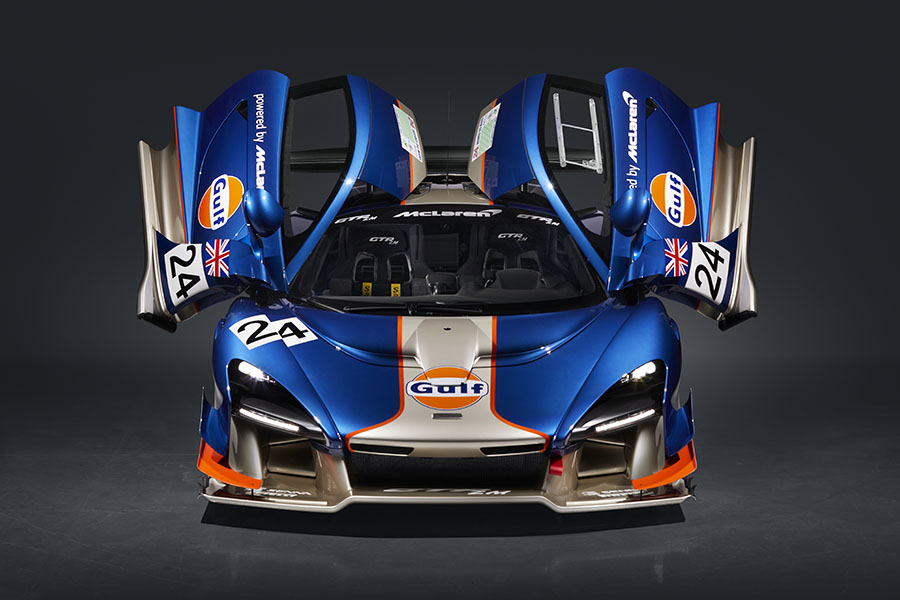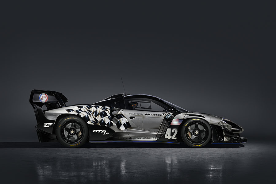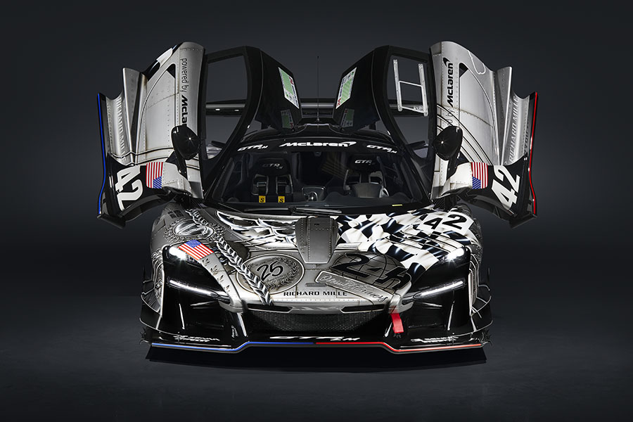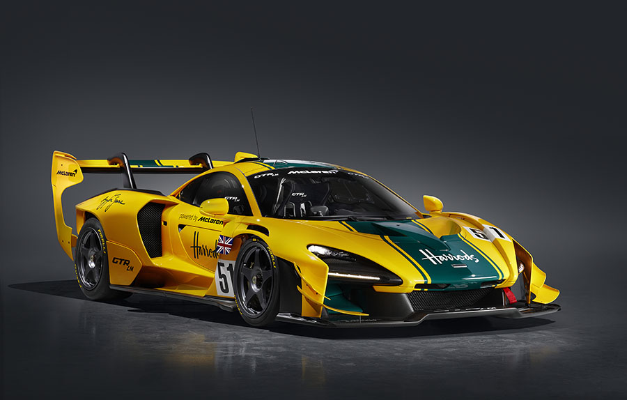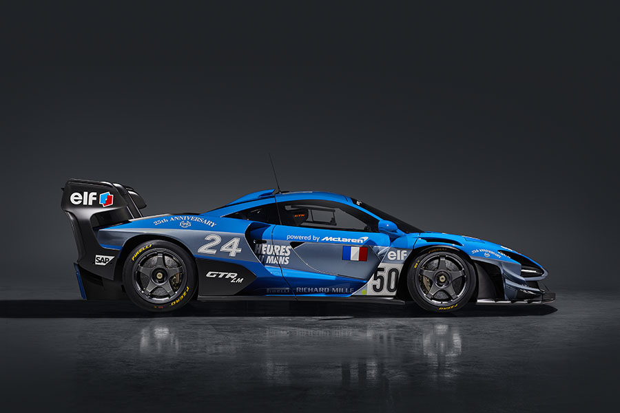 McLaren Senna GTR LM 825/5 is a modern reinterpretation of the livery, drawing in new elements, such as pole position lap times; contemporary race trophies and Le Mans branding cues.