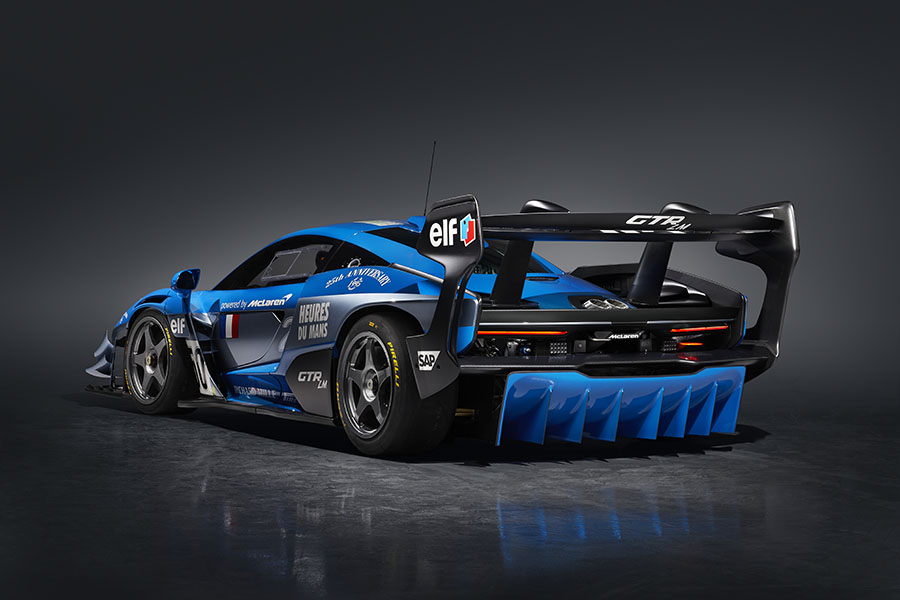 The unmistakeable royal blue livery was proudly French-themed and has been preserved by the McLaren Senna GTR LM’s new owner by the specification of a startlingly bright colour called Le Mans Blue for the body of the car. It looks particularly stunning on the GTR LM’s massive rear diffuser.