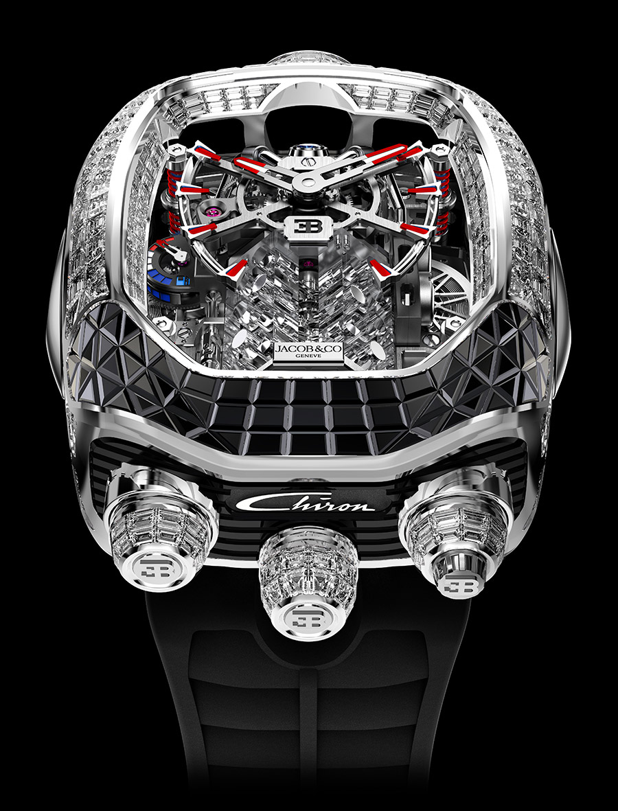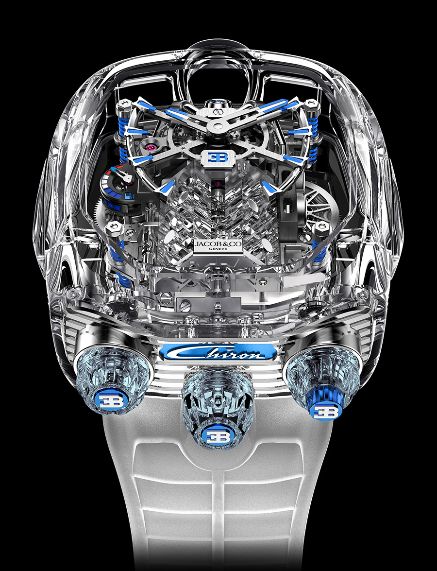 As an interpretation of a Bugatti icon, the timepiece naturally remains true to the company’s design DNA and also conveys its emotionality. Beyond the flying tourbillon with the Jacob & Co. logo, a subtle ‘EB’ logo from Bugatti adorns the engine compartment, where the ‘crankshaft’ holds 16 pistons, all poised and ready for action. The window to the tourbillon is modeled on the horseshoe grille so iconic in Bugatti hyper sports cars.