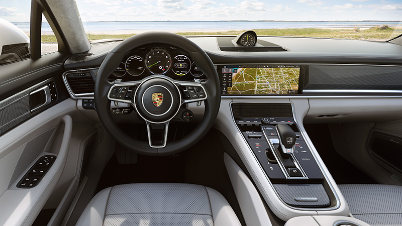 The Turbo S E-Hybrid Sport Turismo offers all of the innovations of the second generation of the Panamera. These include the digitalised Porsche Advanced Cockpit, ground-breaking assistance systems such as Porsche InnoDrive including adaptive cruise control and optional rear-axle steering. Another of these innovations is the roof spoiler, which is unique in the segment, the pitch of which is set to one of three different angles depending on the driving situation and selected vehicle settings. It also generates additional downforce of up to 50 kg on the rear axle. Up to a speed of 170 km/h, the aerodynamic guide element – a central system component of the Porsche Active Aerodynamics (PAA) – stays in its retracted position at an angle of minus seven degrees to follow the roof line, which slopes to the rear. Above 170 km/h, the roof spoiler automatically moves to the performance position with an angle of plus one degree, thereby increasing driving stability and lateral dynamics. When in the Sport and Sport Plus driving modes, the roof spoiler automatically moves to the performance position at speeds of 90 km/h upwards. PAA also provides active assistance by adapting the roof spoiler’s angle of inclination to plus 26 degrees when the panoramic sliding roof is open at a speed of 90 km/h or above in order to compensate for the turbulence created.