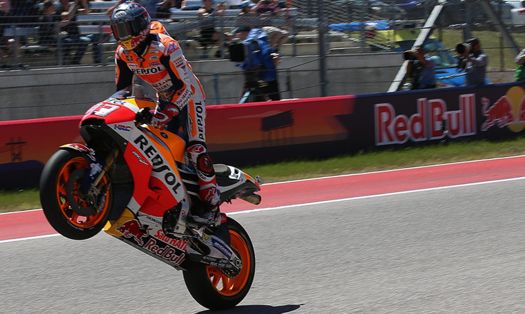 Marc Marquez (Repsol Honda Team) initially fought it out with teammate Dani Pedrosa for victory in the Red Bull Grand Prix of the Americas, before being able to break clear in the latter laps of the race to take his stunning fifth win in a row in Austin – his 11th straight win on US soil in an incredible statistic. Valentino Rossi (Movistar Yamaha MotoGP) then put on a late charge to take second, with Pedrosa completing the podium – and former Championship leader Maverick Viñales (Movistar Yamaha MotoGP) crashing out early on.