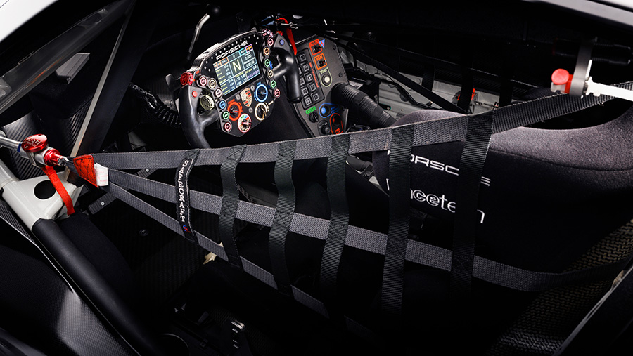To give drivers added protection, the active and passive safety elements in the Porsche 911 RSR have been overhauled. The proven collision warning system allows drivers an even better overview to detect approaching prototype vehicles early enough. The optimised roll cage, the FIA side impact panel in the door and cage as well as additional impact protection for the legs improve the passive safety in the event of an accident. Other features include the removable roof hatch and the rigidly-mounted racing seat featuring a six-point safety harness for the driver.