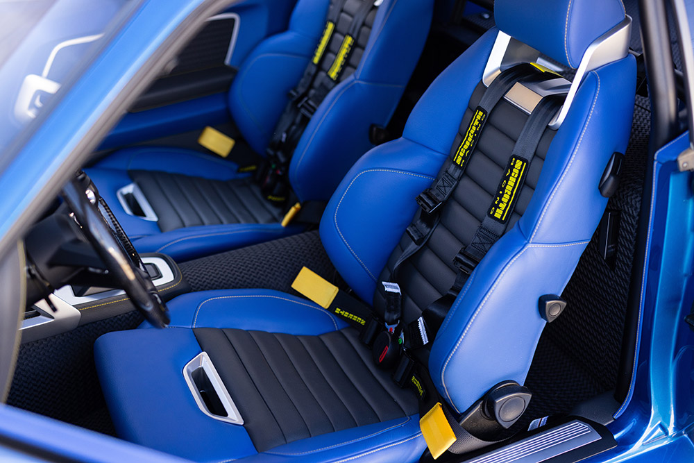 Custom carbon-fiber components abound with rear side scoops that direct air over the taillights, along with a hood and rear diffuser made from the high-strength material. Billet and 3D-printed parts include a one-off rear bumper, seat backs, armrests, door panels, emblems and a host of others.