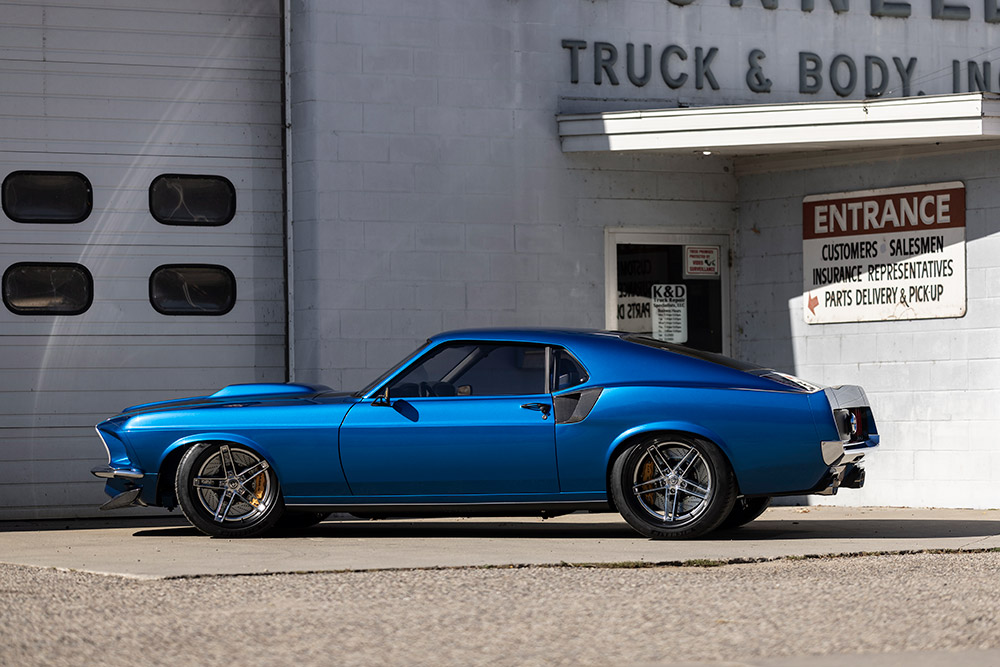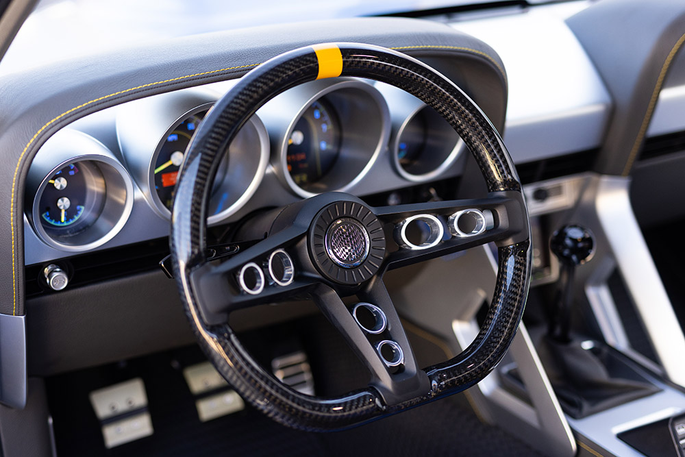 Wrapped around the Roadster Shop FAST TRACK Stage III chassis converted to unibody is the original Mustang Mach 1 body extensively modified by Ringbrothers. It was widened by two inches in every direction, and the rear quarters were lowered. A new floor pan and transmission tunnel were fabricated before a fully bespoke interior and a roll cage were installed. The interior features upholstery and trim work by Avant-Garde Interiors and includes a Vintage Air Gen IV Magnum climate control system, gauges by Dakota Digital, and a custom-made Ringbrothers “The Elder” carbon-fiber hoop steering wheel.