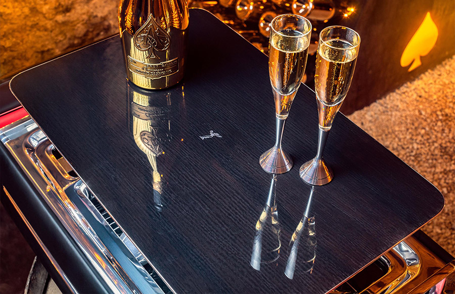 The Champagne Chest is distinguishably Rolls-Royce, embodying the meticulous attention-to-detail and commitment to remarkable handcraftsmanship, characteristic of the marque. The chassis, made from machined aluminium and carbon fibre, is swathed in Natural Grain black leather embossed with the enigmatic Spirit of Ecstasy and flanked by Tudor Oak wood, materials found in the marque’s motor cars. Naturally, should a patron wish to create a Bespoke colour-way, this would of course, be possible.