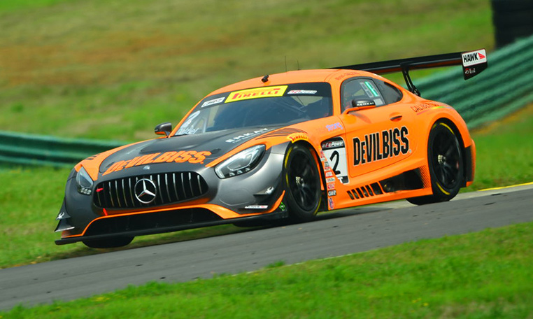 Driving the No. 2 CRP Racing/DeVilbiss Mercedes AMG GT3, the Dalziel/Morad combination led every lap Sunday in the scheduled one-hour SprintX contest with the newcomer Morad putting on a superb showing in his first Pirelli World Challenge event as well as his first race in the Mercedes and at VIR. Dalziel, the veteran sports car star, took over the driving chores at the 33-minute mark and easily held the leading margin to the checkered flag.