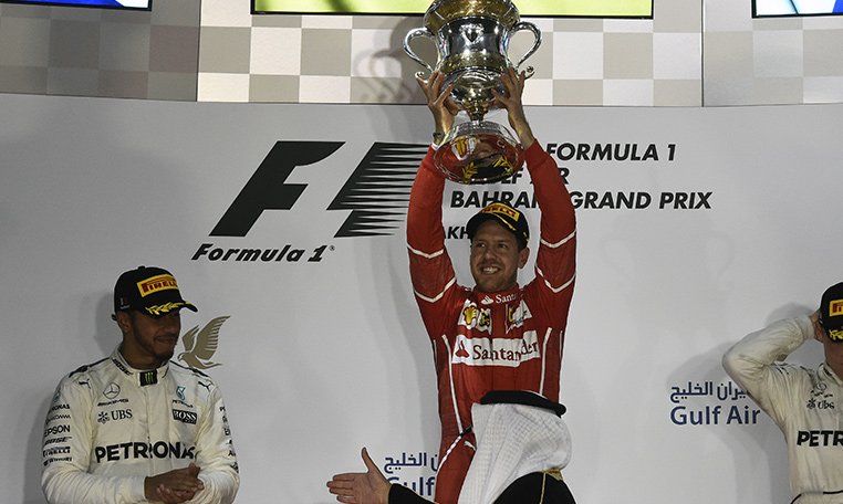 Sebastian Vettel produced a gutsy drive this evening to win the Bahrain Grand Prix, having started from third on the grid. His victory was also down to the strategic calls from the Scuderia Ferrari pit wall. Kimi Raikkonen finished fourth, despite encountering a few difficulties. He fought back to finish just off the podium. After the first three rounds, Ferrari lead the Drivers’ Championship with Seb, on 61 points, and the Constructors in which it has 102 points. This is Seb’s fifth won in Prancing Horse colours.