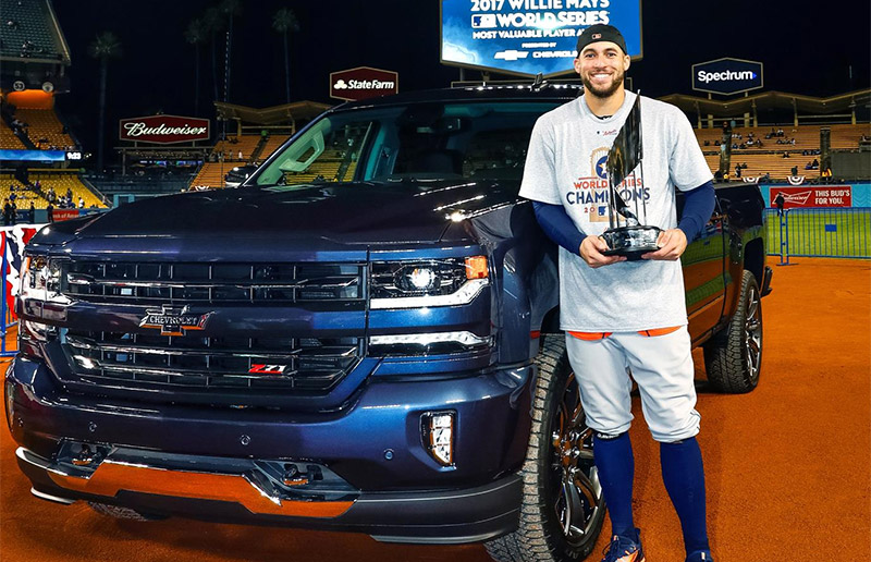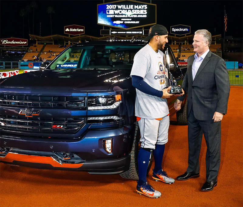 The 2017 Willie Mays World Series Most Valuable Player, George Springer, was presented with a 2018 Chevrolet Silverado Centennial Edition pickup in recognition of his strong performance on the field as the Houston Astros won the first World Series championship in their franchise history.