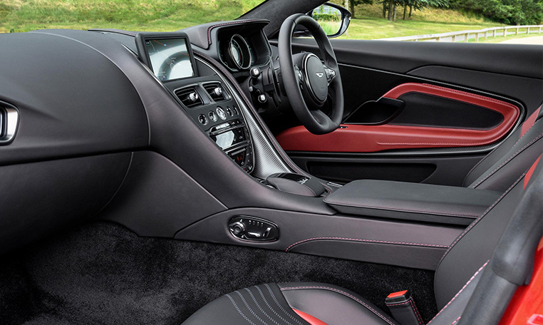 Inside, the Aston Martin Design Team elected for a scheme that reverses the exterior colours, with extensive use of Metallic Black leather and a Q by Aston Martin Trim Split that introduces flashes of Chancellor Red leather on the seats and door panels. Chancellor Red contrast stitching unites the two upholstery hues and highlights the meticulous craftsmanship that defines Aston Martin interiors. Swathes of Obsidian Black Alcantara are used on the headlining and cantrails, while a Shadow Chrome Jewellery pack adds another sleek and subtle layer of detailing.