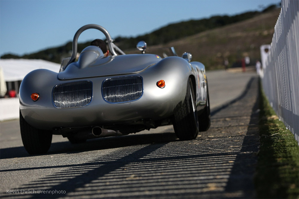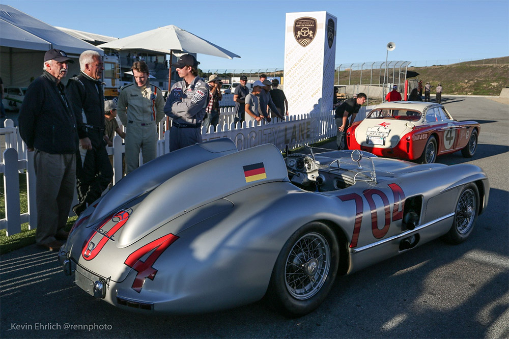 At an event overflowing with historically significant, well prepared, rare, and exotic machinery, one car overshadowed others, stopped traffic and commanded camera attention. Mercedes entered a trio of 300 SLRs in the 1955 Mille Miglia and recorded a 1-2 finish with Stirling Moss and Juan Manuel Fangio. Hans Hermann drove the third car but encountered a loose fuel filler cap which showered driver and navigator with fuel. An unplanned meeting with a rock wall resulted and the car retired. Hermann’s car, number 704 in reference to the 7:04 starting time, was subsequently repaired and found its way to the Laguna Seca paddock 66 years later.