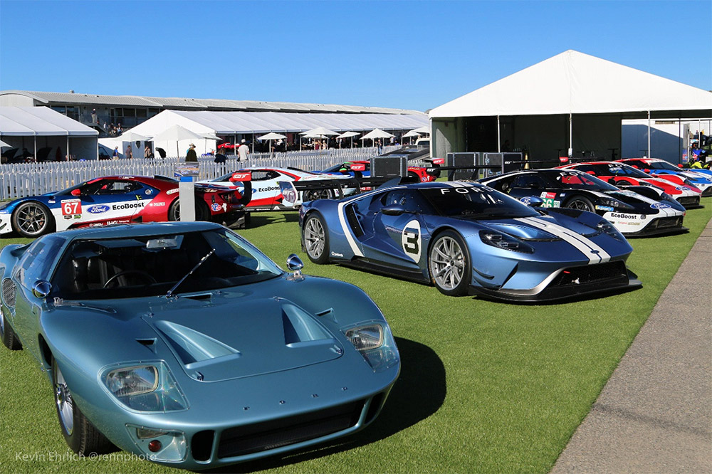 Ford Motor Company brought several of their most powerful road cars along with a carbon fiber development mule from the GT road car project. The engine bay was empty, but the wiring, zip ties, and rough interior remained from emissions testing duty. Velocity Invitational arranged a reunion of six of the eight Ford GTLM race cars built, representing the full spectrum of IMSA and World Endurance Championship competition. It was likely the first time that all were in the same place at the same time. One Ford GT LM race car missing was the 2016 LeMans winning car which lives in retirement at the Ford museum, still covered in race grime.