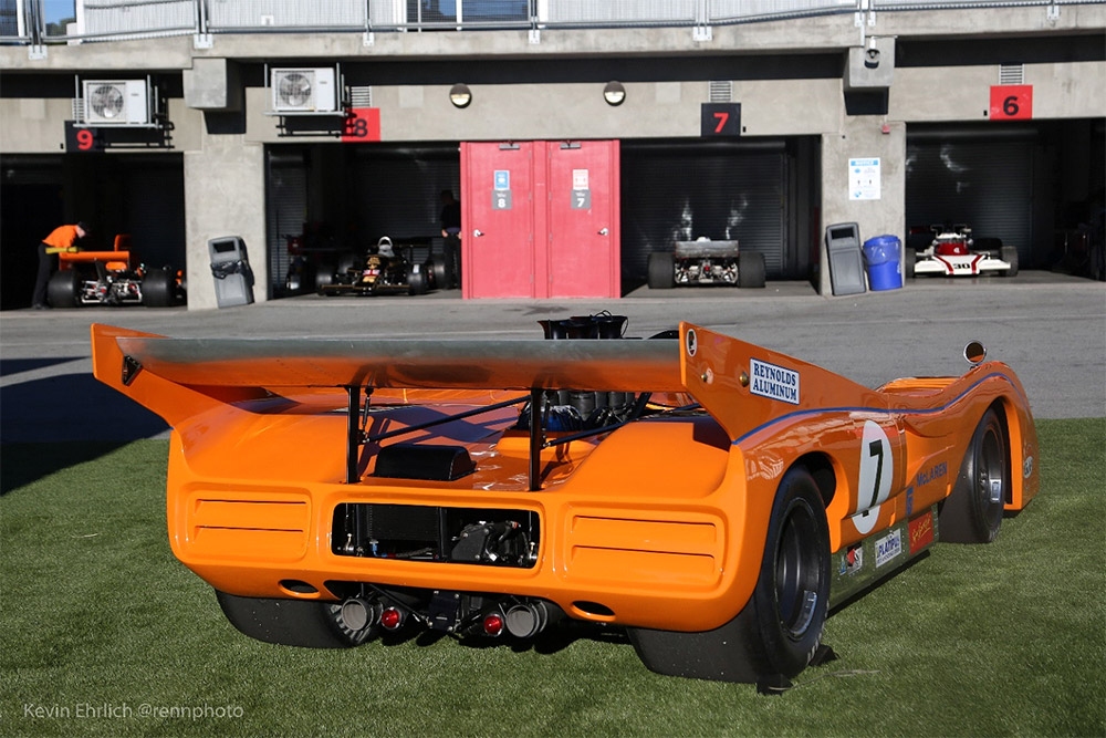 The Petersen Museum hosted a panel discussing the future of motorsport on Friday evening. A pre-event reception overlooked Turn 4 as the Mustang and Mini race raged. Paul Pfanner, CEO of Racer magazine hosted a distinguished panel comprised of Jim Farley, CEO of Ford, Zak Brown, CEO of McLaren Racing, Jacob Hawksworth, Founder and CEO of Hypercraft, Jay Frye, President of INDYCAR and Richard Varner, CFO of MotoAmerica. The Petersen Museum also brought a collection of custom hotrods that were commissioned by Metallica front-man James Hetfield. The rolling artwork was positioned within eyeshot of the 917 group – quite a contrast between gentle sweeping curves and brutish racing function.