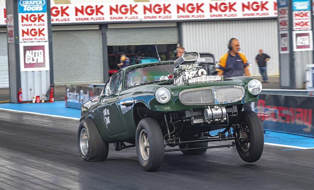 Owned and built by Somerset-based Lee Johnstone, the Volvo P1800 is raced by him and his three daughters – Ellie, Tori and Sarah – with supportive wife Sue also part of the team, which competes under the name of JD Racing (Johnstone & Daughters). Originally purchased as a stripped shell that was too far gone to restore as a road car, the Gasser has a 600bhp big block supercharged 454 Chevrolet V8 engine, which has powered it to run a quarter mile drag race in 10.01 seconds and reach a top speed of 133mph.