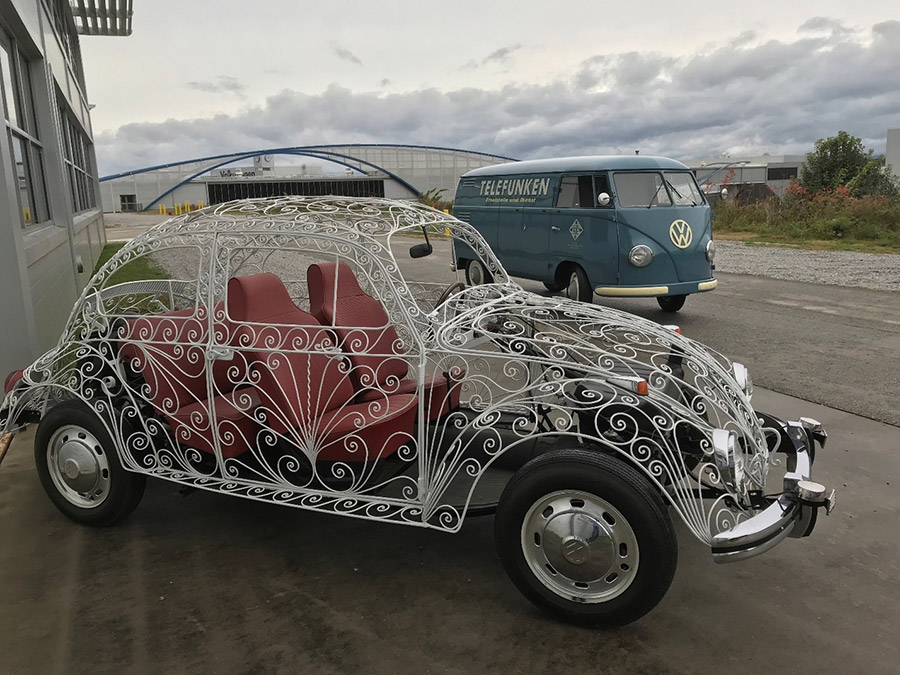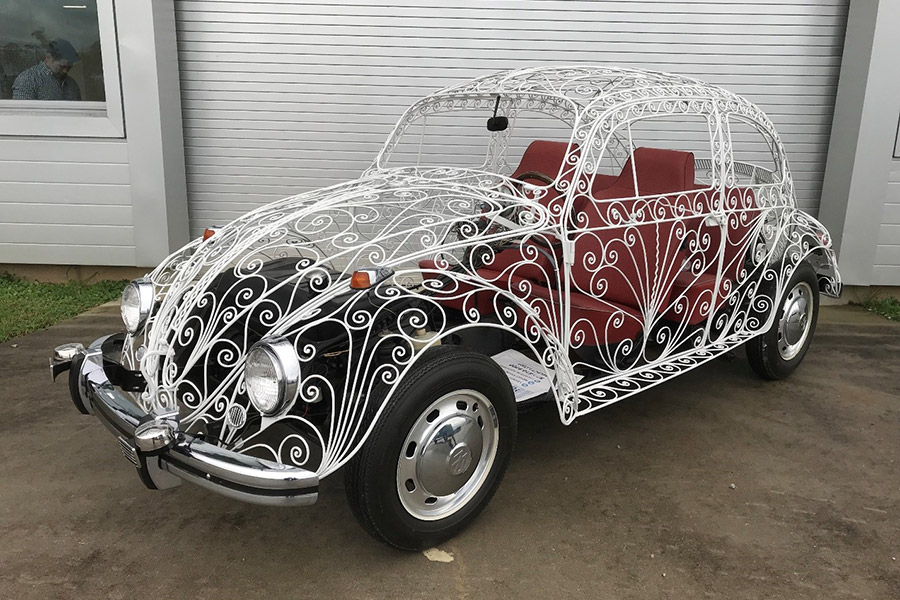 Using a Beetle as his base, Esparza-Prieto built the skeleton of the vehicle out of white wrought iron and artistically filled in the gaps with unique floral patterns and decorative swirls. The auto store owner was so impressed with his work that he displayed the finished product on a rotating platform outside his business, where it quickly drew local attention and the eye of Volkswagen executives down the road at the newly built Puebla plant.